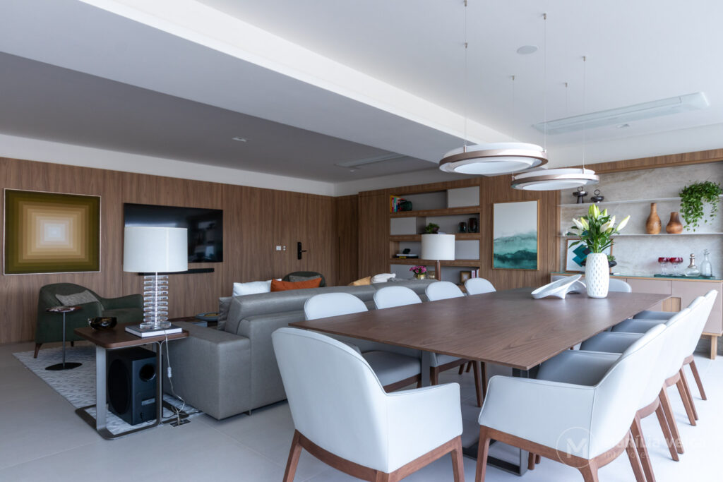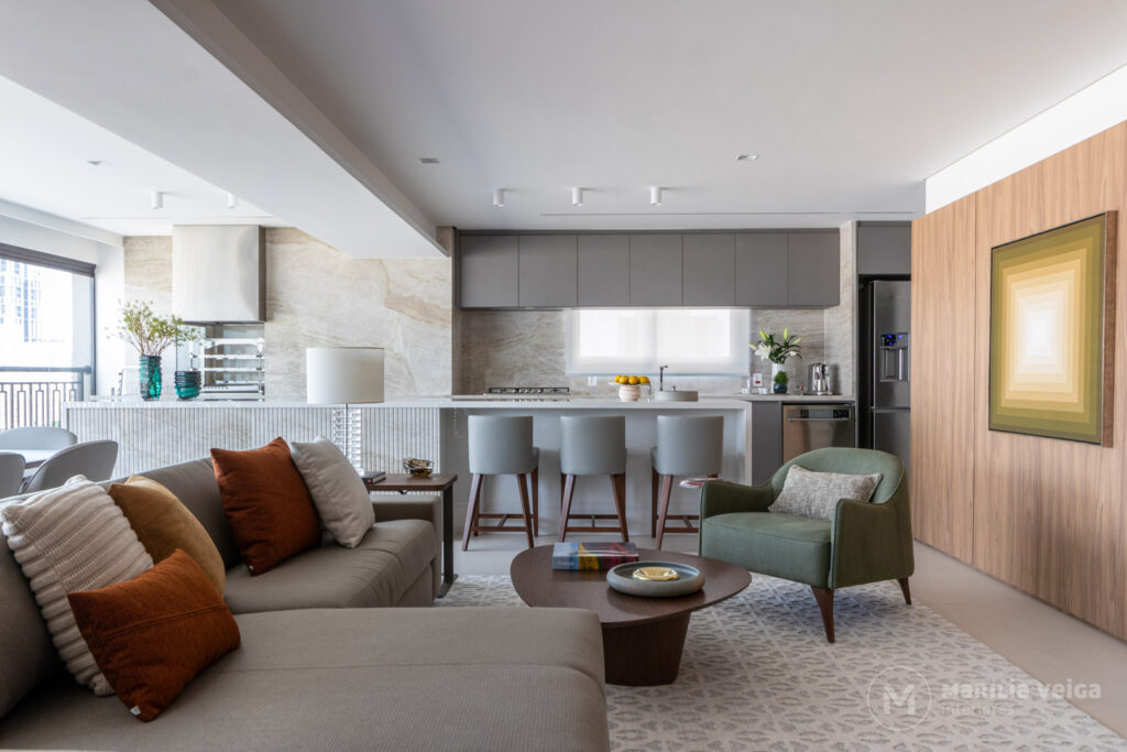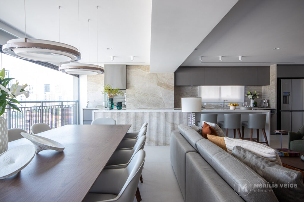O resultado é um espaço contínuo, onde estar, jantar e cozinhar acontecem de forma integrada, ideal para um casal que ama cozinhar e receber.