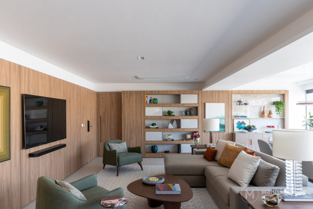 Grande parte das paredes foi desenhada com painéis, estantes e volumes que combinam estética e funcionalidade. Criamos uma composição rica, com nichos, bookcases fechados e elementos em pedra, que trazem profundidade ao ambiente.