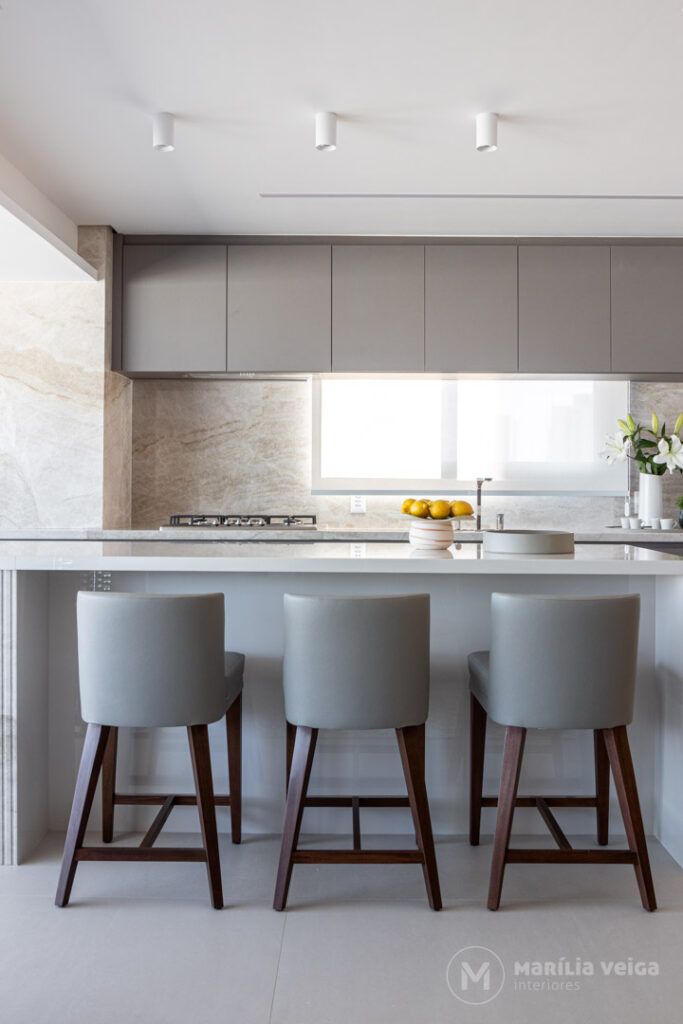 Outro ponto importante é a bancada com banquetas, que complementa a área de jantar e amplia as possibilidades de uso no dia a dia.