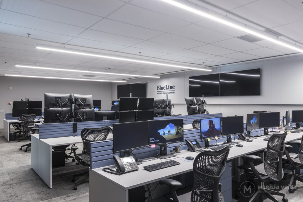 O coração do escritório é o trading floor — área operacional onde a performance é prioridade.