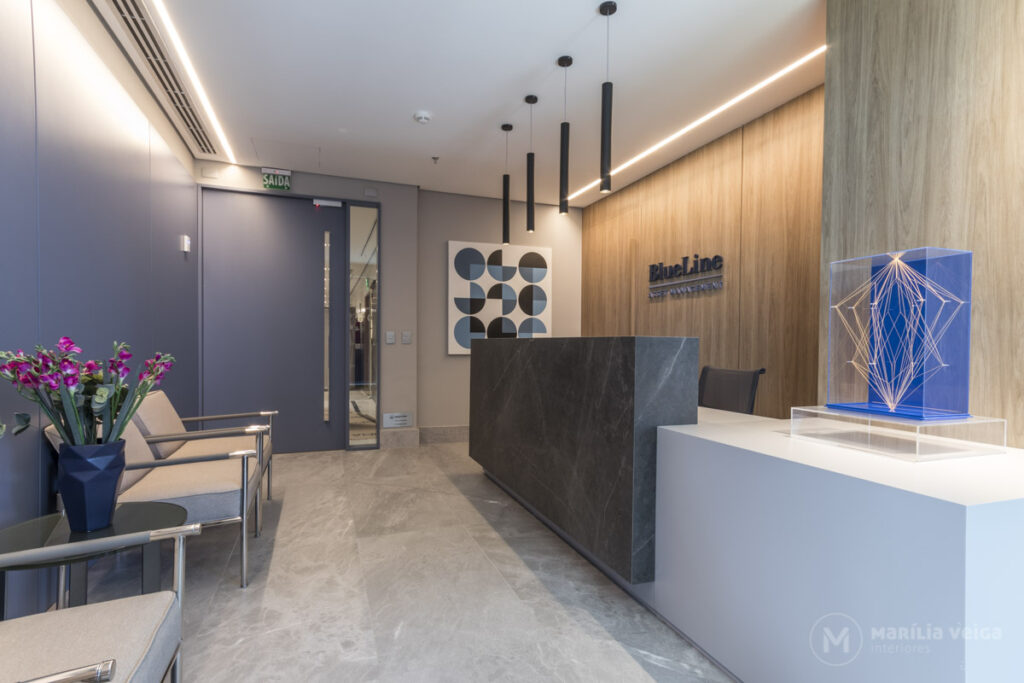 Logo na entrada, o projeto traduz a identidade da empresa através de uma paleta sofisticada, com destaque para o azul — referência direta ao nome da marca. A porta em tom marcante, com puxador em acrílico e detalhe em vidro, já antecipa o cuidado com os detalhes.